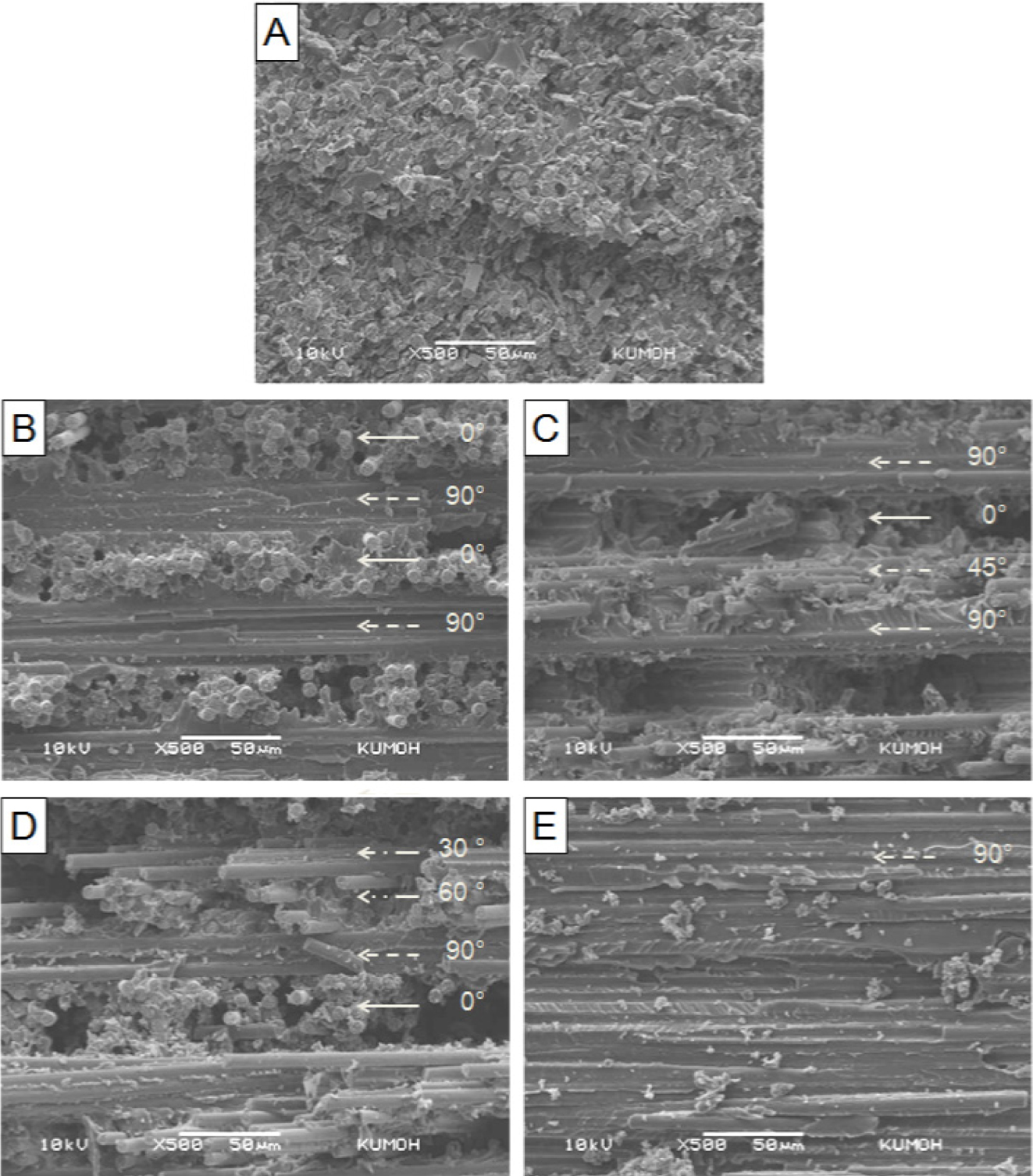 Figure 5 SEM micrographs (×500) of the fractured surfaces of non-crimp carbon fiber fabric/epoxy composites with differentangle-plies: (A) [0°] composite; (B) [0°/90°] composite; (C) [0°/45°/90°] composite; (D) [0°/30°/60°/90°] composite; (E) [90°] composite. |