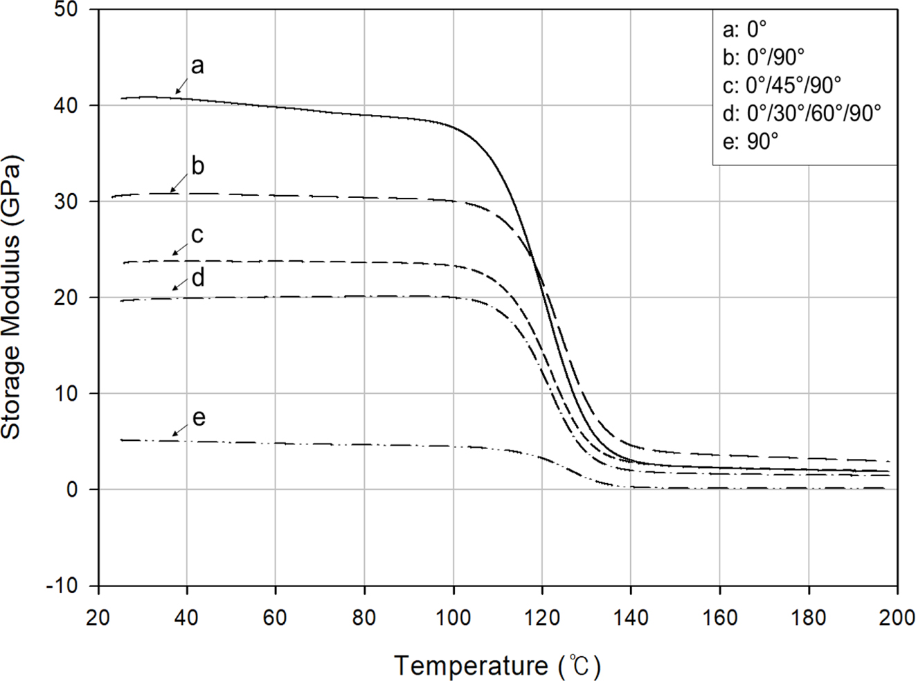 측정한 모든 탄소섬유직물/에폭시 복합재료에서 약 100 °C 이후에 급격한 저장탄성률의 감소가 발생하였다. [0°] 복합재료의 저장탄성률은 상온에서 약 40 GPa였으나, 160 °C에서 약 2 GPa로 약 95% 감소하였고, [0°/90], [0°/45°/90°] 및 [0°/30°/60°/90°] 복합재료의 경우에는 160 °C에서 저장탄성률 값이 약 1-3 GPa로 25 °C에 비해 약 90% 이상 감소하였다. [90°] 복합재료의 저장탄성률은 160 °C에서 약 0.2 GPa로 가장 낮은 값을 보이면서 25 °C에서의 저장탄성률 대비 약 96%가 감소하였다. 이는 25 °C에서 rigid한 성질의 탄소섬유와 함께 에폭시 매트릭스 내 분자사슬의 움직임이 온도 증가에 따라 활발해지면서 유리전이온도를 지나 동역학적 성질이 크게 저하되었기 때문이다. 즉, 상온에서 탄성적인 성질을 더 많이 가지고 있었던 복합재료가 온도가 증가함에 따라 보다 점성적인 성질이 커지면서 주기적인 동역학적 하중에 복합재료가 충분히 저항하지 못하였기 때문이다. [0°] 복합재료의 저장탄성률이 약 100 °C 이상에서 다른 복합재료에 비해 다소 빠르게 감소하는 현상은 [0°] 복합재료는 전형적인 UD 복합재료 형태로 탄소섬유가 한 방향으로만 위치하고 있고 다른 방향에는 보강섬유가 존재하고 있지 않아 에폭시 매트릭스 내 분자사슬의 움직임이 온도 증가에 따라 좀더 활발해졌기 때문인 것으로 해석된다. 아울러 [0°] 복합재료의 경우 상온에서의 저장탄성률이 다른 배향각을 갖는 섬유로 구성된 복합재료보다 상대적으로 가장 큰 현상도 [0°] 복합재료의 저장탄성률이 100 °C 이상에서 큰 감소에 영향을 주었을 것으로 여겨진다.