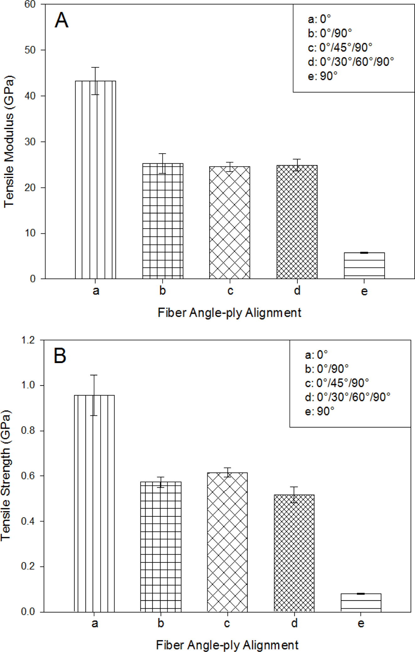 Figure 7 Comparisons of the (A) tensile modulus; (B) tensile strength of non-crimp carbon fiber fabric/epoxy composites with different angle-plies. |