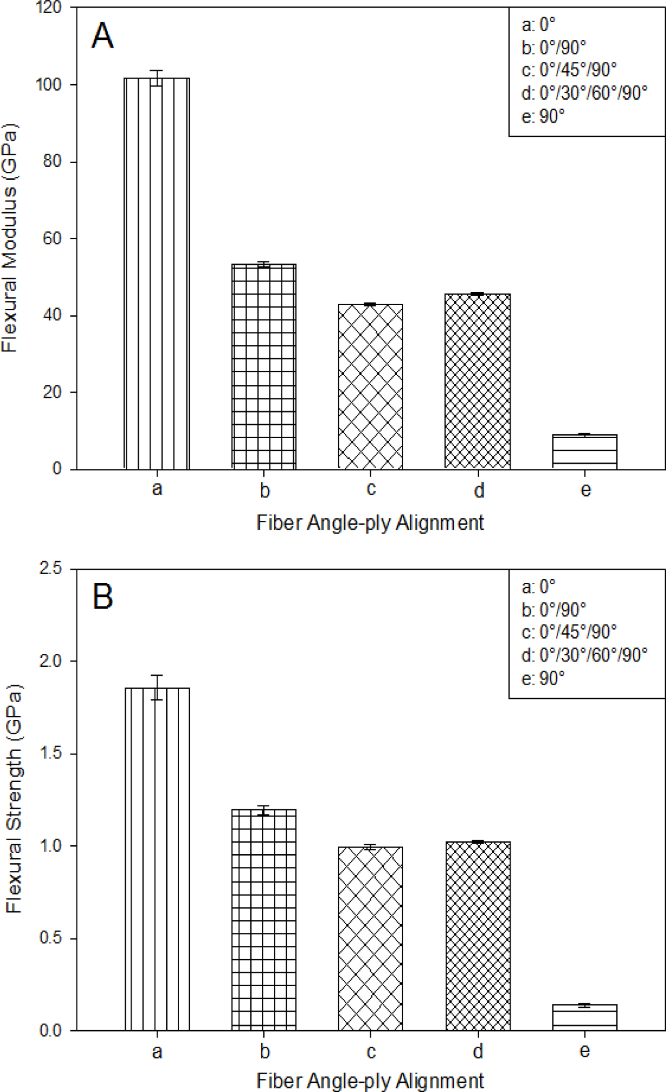 Figure 8 Comparisons of the (A) flexural modulus; (B) flexural strength of non-crimp carbon fiber fabric/epoxy composites with different angle-plies. |