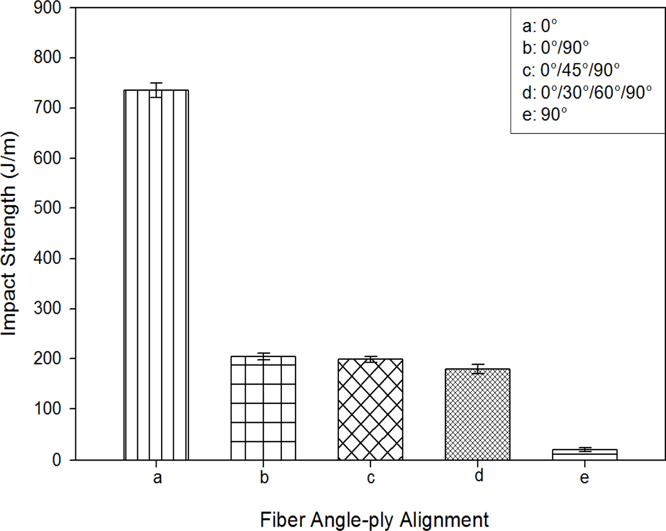 충격강도는 [0°/90°], [0°/45°/90°] 및 [0°/30°/60°/90°] 복합재료보다 약 3.5배 높았고, [90°] 복합재료보다
