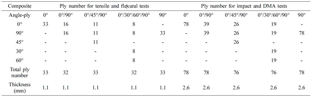 인장, 굴곡 및 충격 특성에 미치는 프리프레그 적층 방향에 따른 angle-ply의 영향을 조사하였다.