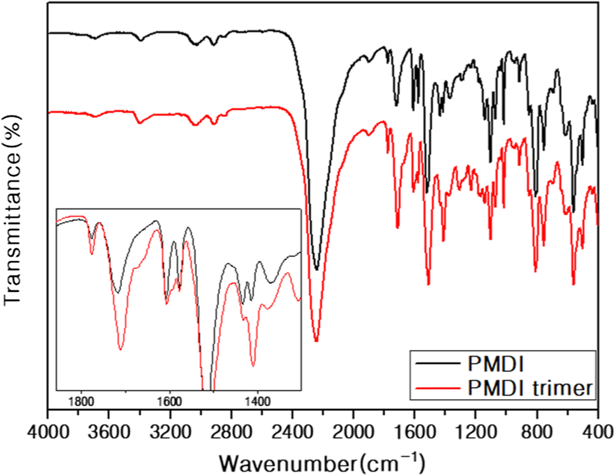 PMDI의 구조변화를 확인하기 위해 측정된 PMDI와 PMDI trimer의 FTIR 스펙트럼을 Figure 3에 나타내었다. 일반적으로 이소시아누레이트의