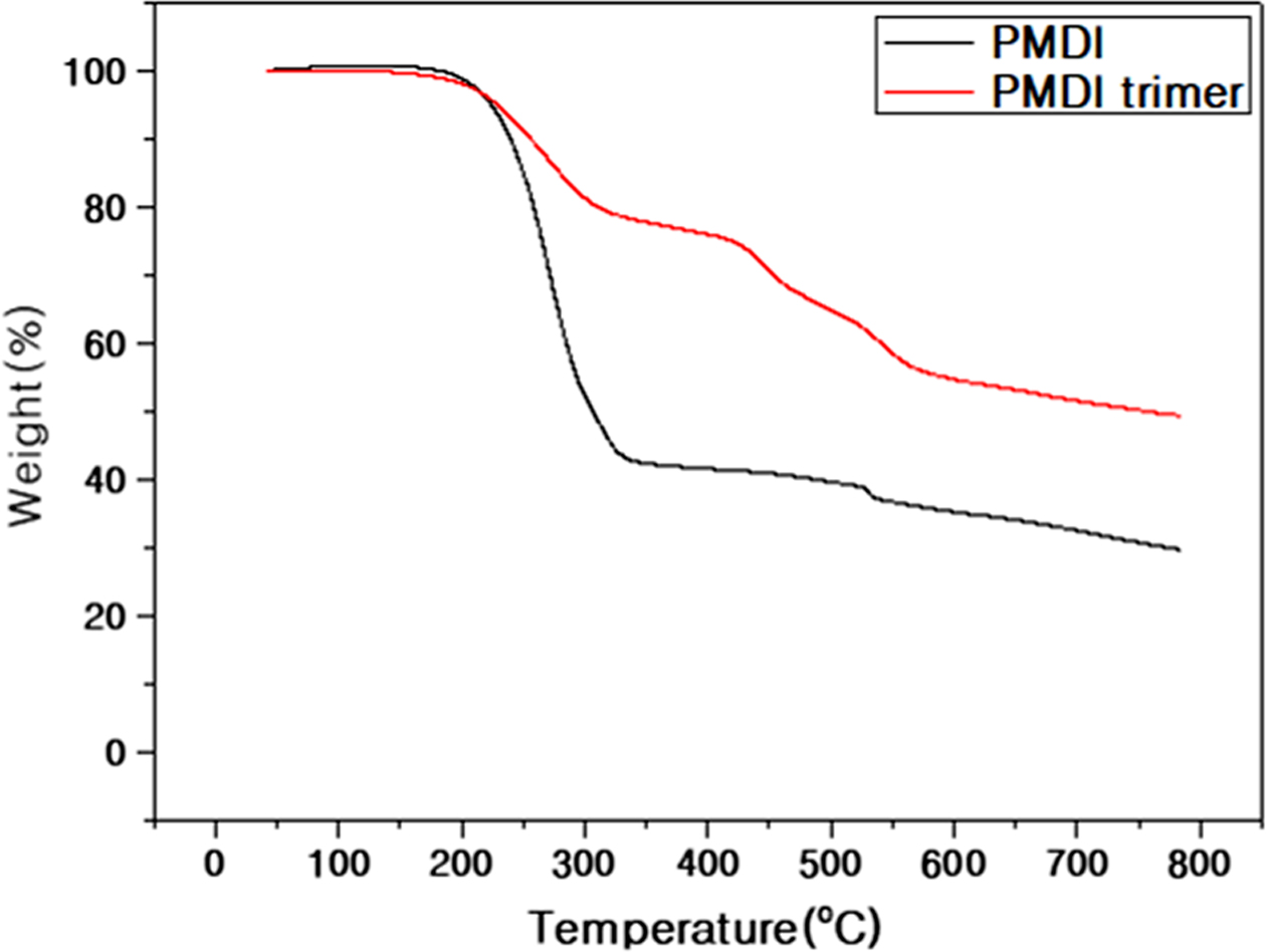 보이는 PMDI trimer의 TGA 프로파일을 통해 pre-trimerization이 진행되는 과정에서 두 가지의 생성물이 생성되었으며 이로