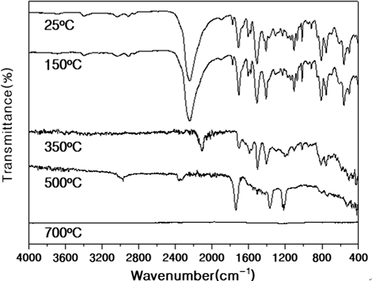 것을 확인하였다.26 이후 두 번째와 세 번째 분해 구간의 온도보다 높은 500, 700 oC에서 샘플을 가열했을 때 카보디이미드와 이소시아누레이트를
