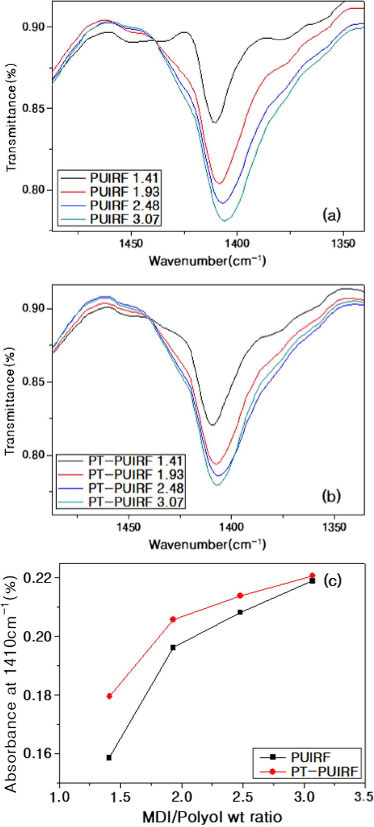 이소시아네이트의 질량 비와 관계없이 1410 cm-1에서 나타난 PT-PUIRF의 FTIR 흡광도는 PUIRF보다 항상 강하게 나타났고