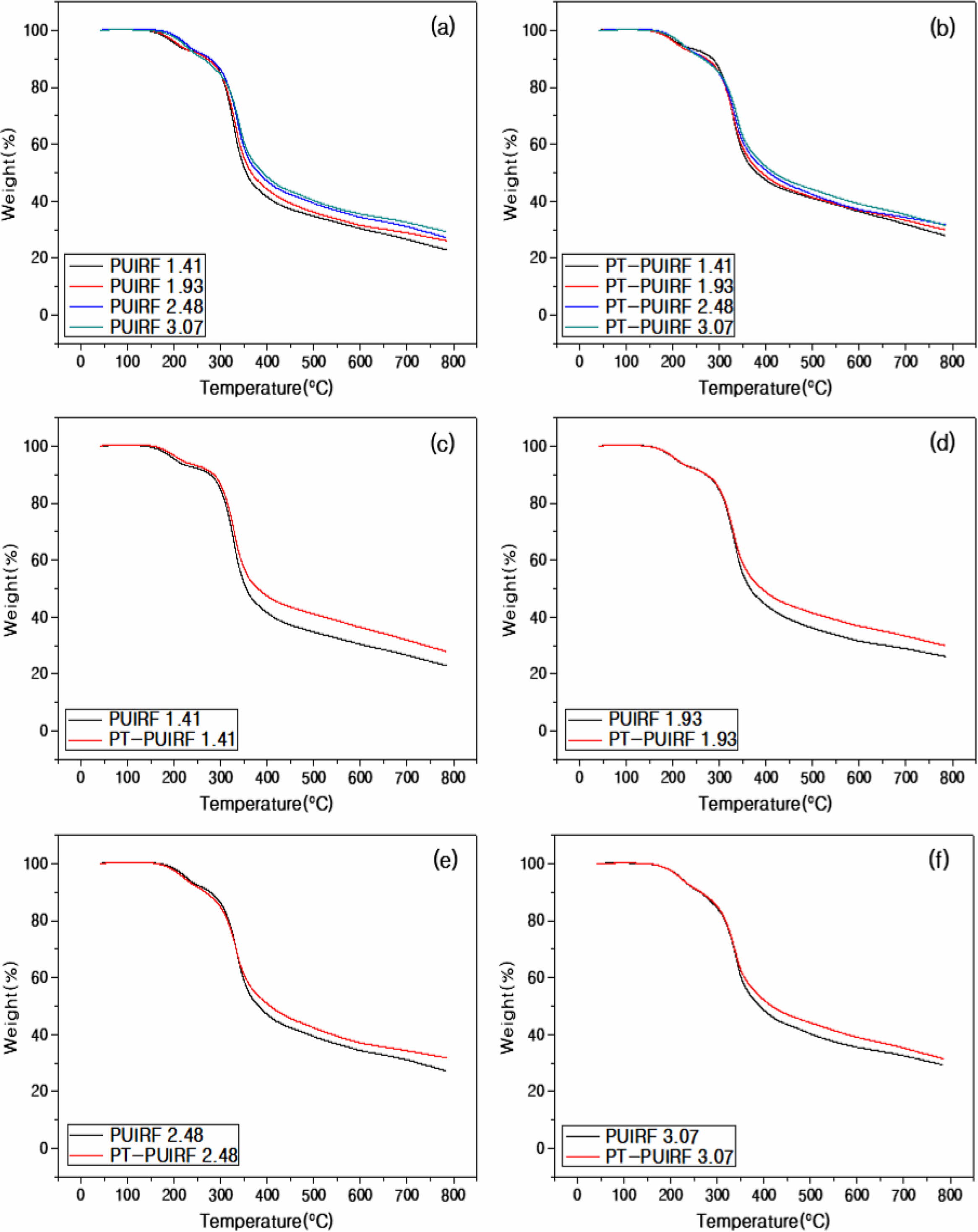 7(c)-(f)에 나타낸 동일 질량 비 사이의 PUIRF와 PT-PUIRF의 TGA 프로파일을 살펴보면 질량 비와 관계없이