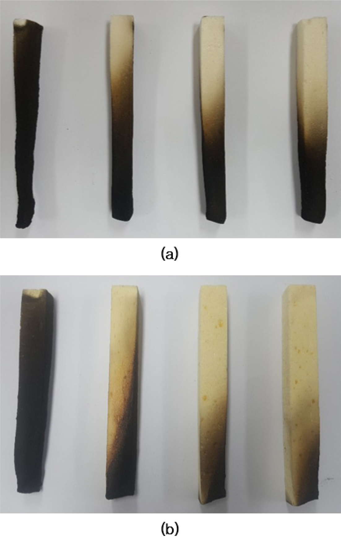 Figure 8 Optical images of (a) PUIRF; (b) PT-PUIRF after UL94 V test (Isocyanate/Polyol wt ratio = 1.41, 1.93, 2.48, 3.07 left to right). |