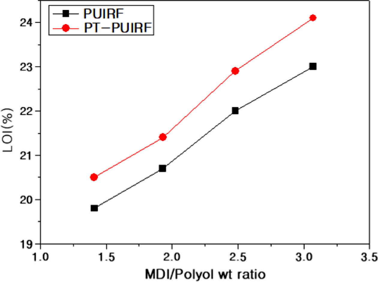 폼이 난연제가 첨가되지 않은 폼보다 더 높은 LOI를 나타내었다. 또한 두 경우 모두 PT-PUIRF가 PUIRF 보다 더 높은 LOI를 나타내었다.