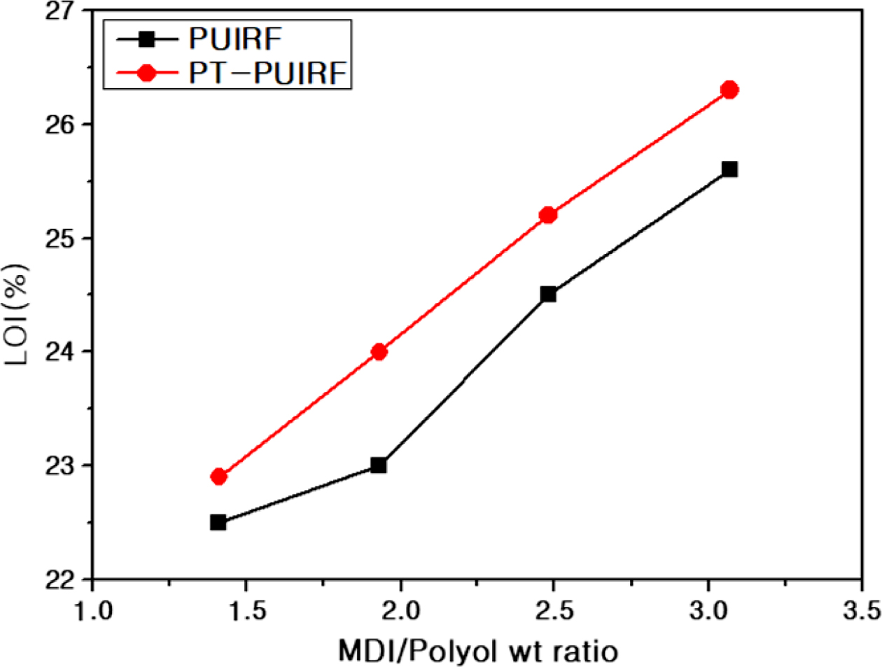 LOI, UL94 V 및 만능시험기를 사용하여 합성된 PT-PUIRF와 polyurethane-polyisocyanurate foam(PUIRF)의 열 안정성과 기계적 물성을 비교하였다. FTIR을 통해 PT-PUIRF에 포함되어 있는 이소시아누레이트의