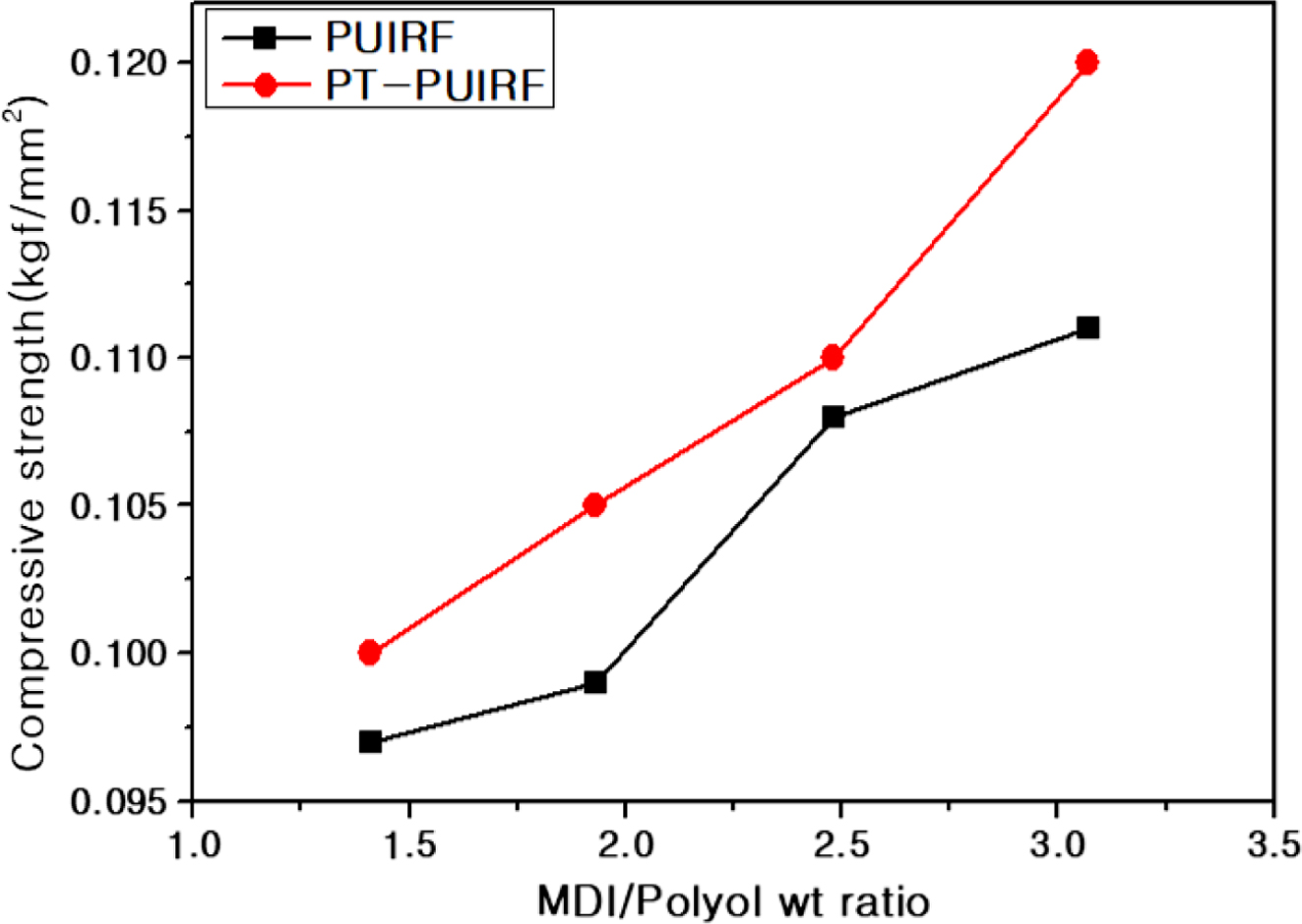 PUIRF와 PT-PUIRF의 압축강도. Figure 6의 결과를 통해 폴리올 대비 이소시아네이트의 질량 비가
