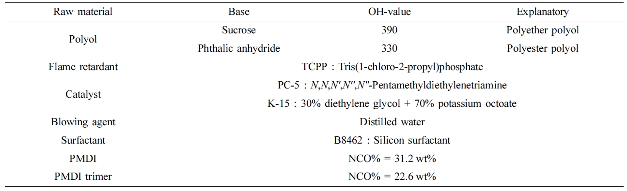 위해 사용된 이소시아네이트는 BASF 사로부터 제공받은 NCO 31.2 wt%의 PMDI를 사용하였으며 MCNS 사의 SR500과 애경 사의 Pol1001을 각각 ether 폴리올과 ester 폴리올로서