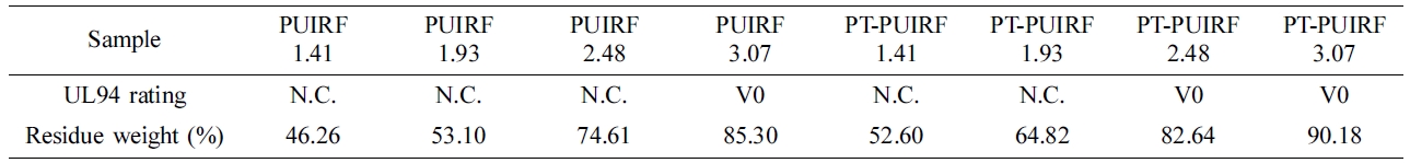 무게비가 PUIRF보다 높은 것을 통해 난연제가 첨가된 경우에도 PT-PUIRF의 난연성이 더 높게 나타나는 것을 확인하였다.