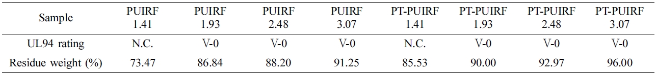 1.93 이상일 때 V0의 난연성을 나타내었다. 하지만, 같은 난연등급을 나타내는 폼일지라도 동일 이소시아네이트 질량비에서 PT-PUIRF의 잔량