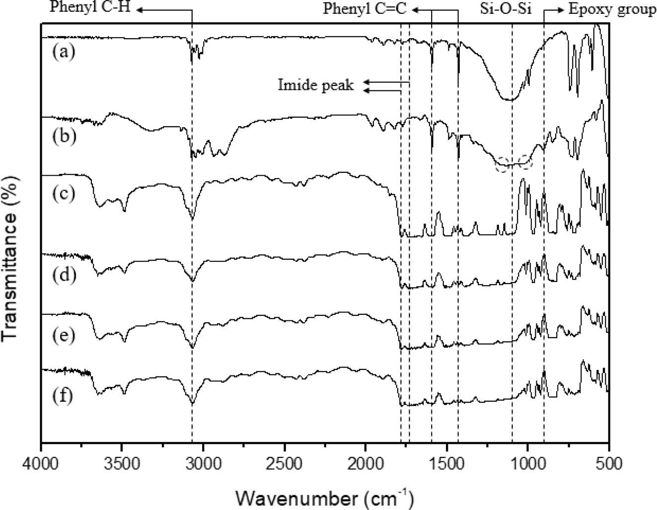 그룹이 화학적으로 반응하였음을 확인하였다. 하이브리드 폴리이미드 필름에서 LPS의 중량비가 증가함에 따라 이미드 그룹의 특징적인 피크의 변화는 없었으나 Si-O-Si 피크의 폭이 넓어지는 것을