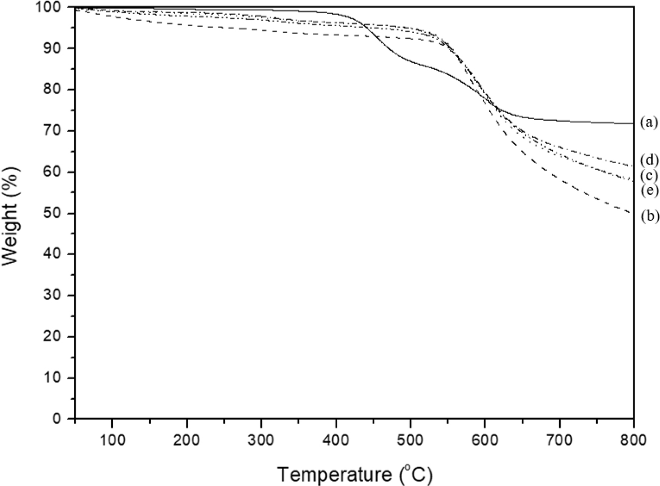 Figure 3 TGA thermograms of (a) LPS; (b) PI-0; (c) PI-1.5; (d) PI-2.5; (e) PI-3.5 under nitrogen at heating rate of 10 oC/min. |