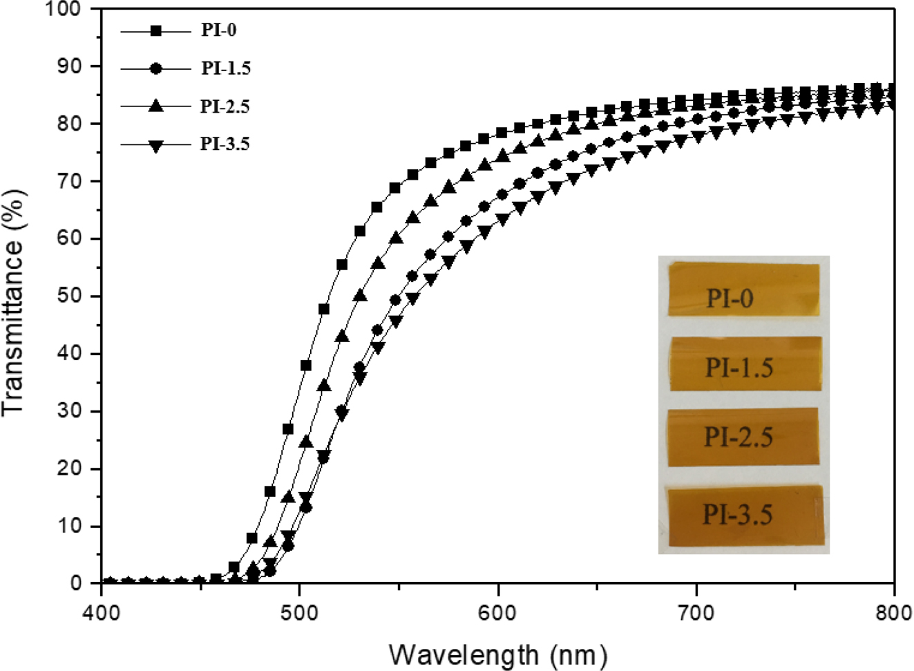 Figure 5 UV-vis spectra of PI-0, PI-1.5, PI-2.5, and PI-3.5. |