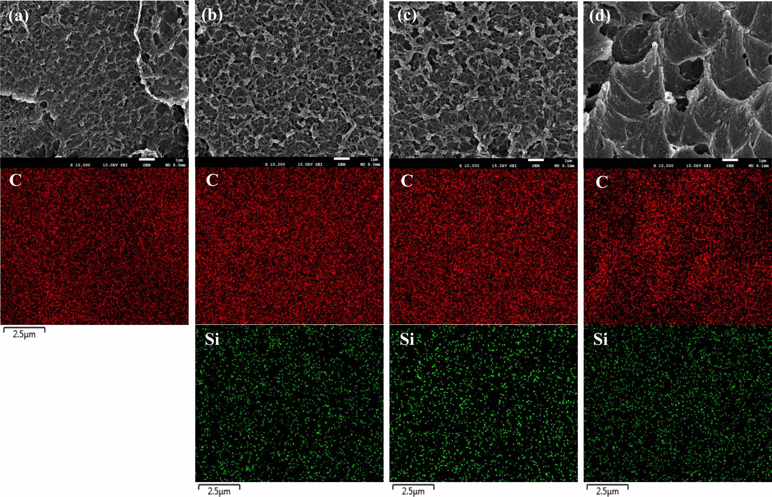 Figure 6 Cross-sectional SEM and EDS mapping images of (a) PI-0; (b) PI-1.5; (c) PI-2.5; (d) PI-3.5 (C - carbon atom, Si – silicon atom). |