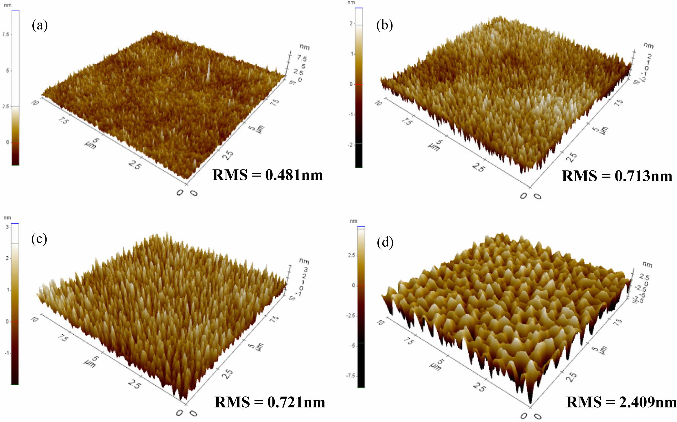 Figure 7 Three-dimensional AFM images of (a) PI-0; (b) PI-1.5; (c) PI-2.5; (d) PI-3.5. |