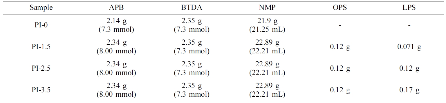 PI-1.5 제조 방법을 Scheme 2에 나타내었다. Octaphenyl-POSS (0.071 g)를 반응용매 NMP(22.21 mL)에 넣고 60 oC에서 녹인 후, 이 용액에 APB(2.34 g, 8.00 mmol)와 BTDA(2.35 g, 7.3 mmol)를 순서대로 넣고 20분간 혼합하였다. 이 용액을 1시간 동안 교반한 후 LPS(0.071 g)를 넣고 23시간 동안 질소 분위기의 상온에서 격렬히
