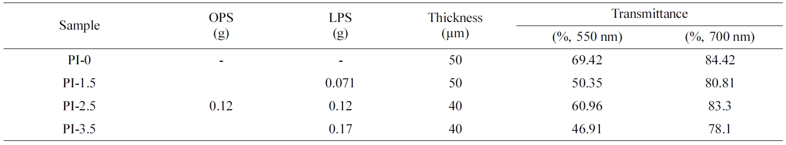 증가에 따라 점차로 증가하였다. 또한 광학 특성은 순수한 폴리이미드보다는 OPS와 LPS의 도입으로 하이브리드 폴리이미드 필름의 경우에는 광투과도가