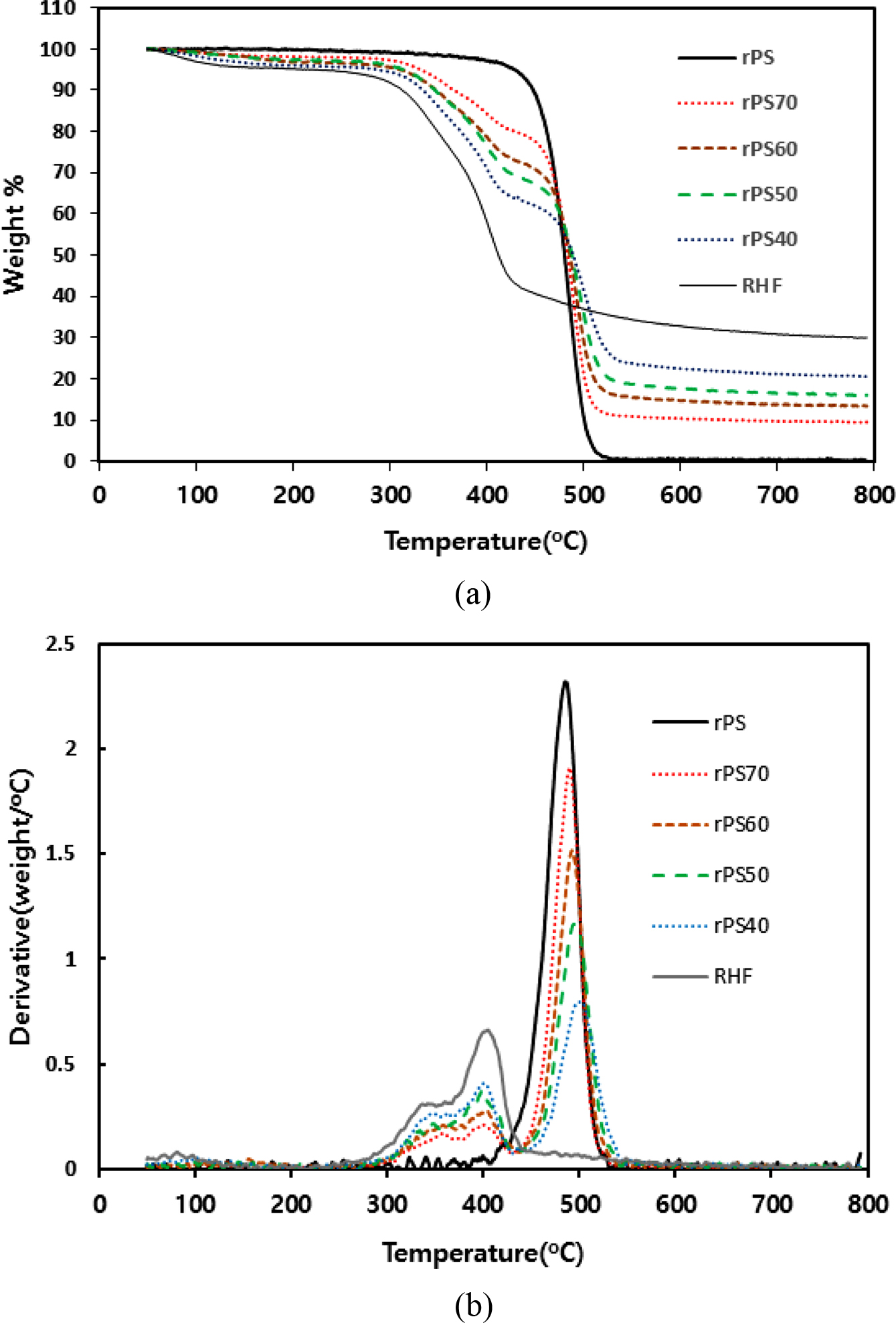 (a) TGA; (b) DTG thermograms of rice husk flour reinforced recycled polystyrene composites.