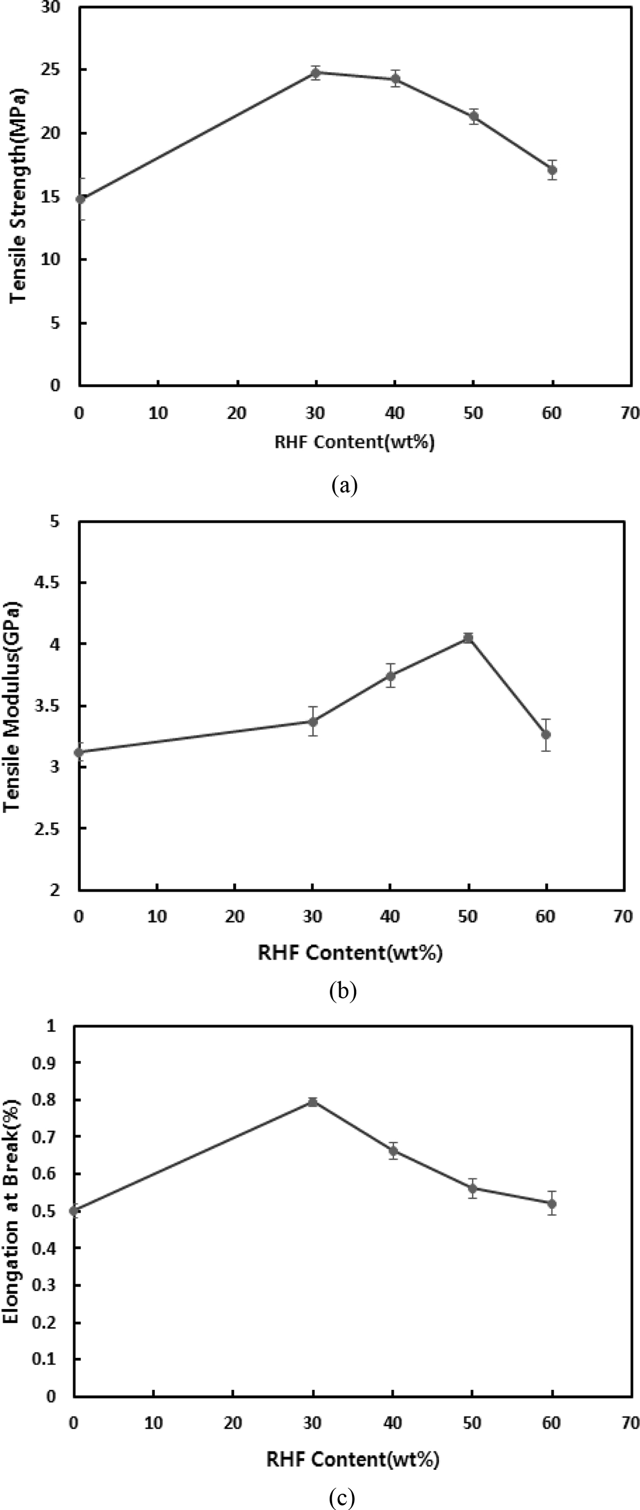 (a) Tensile strength; (b) tensile modulus; (c) elongation at break of rice husk flour reinforced recycled polystyrene composites.