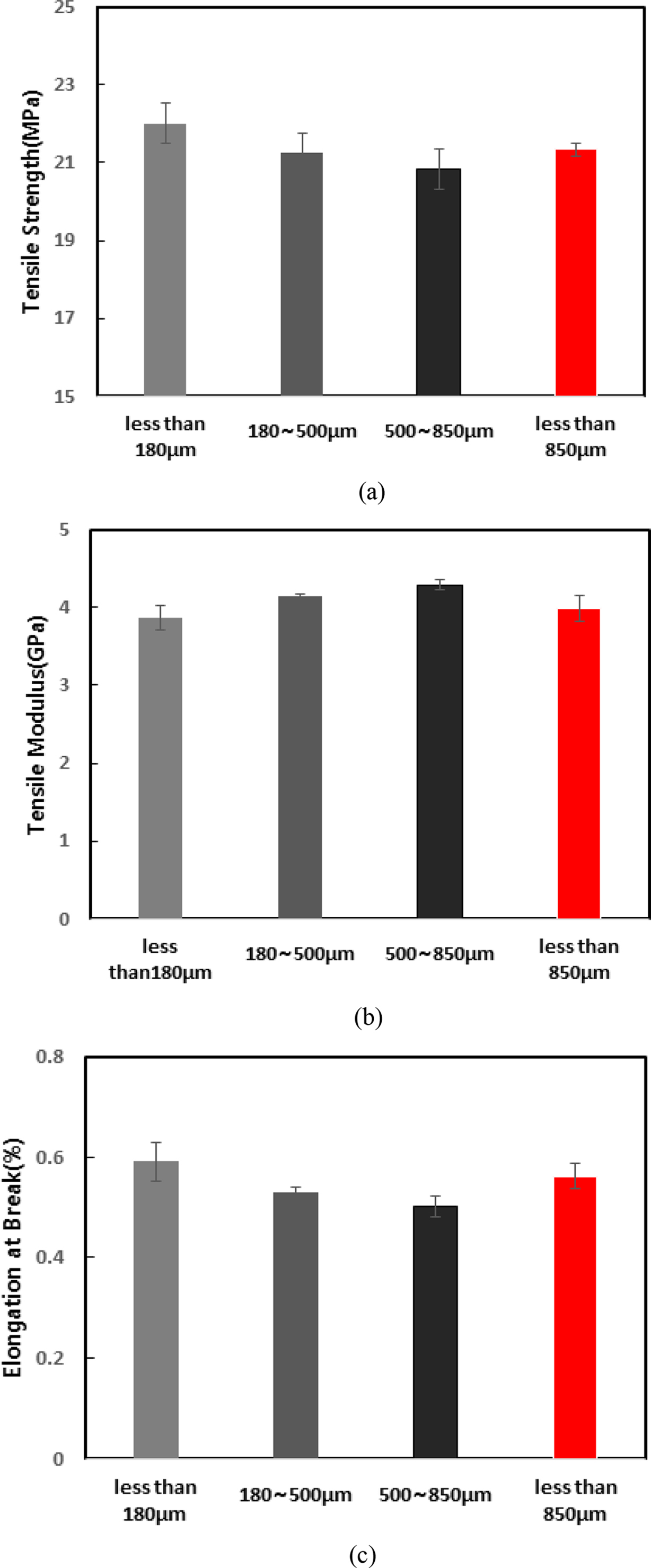 (a) Tensile strength; (b) tensile modulus; (c) elongation at break of rice husk flour reinforced recycled polystyrene composites with different size distributions of rice husk flour.