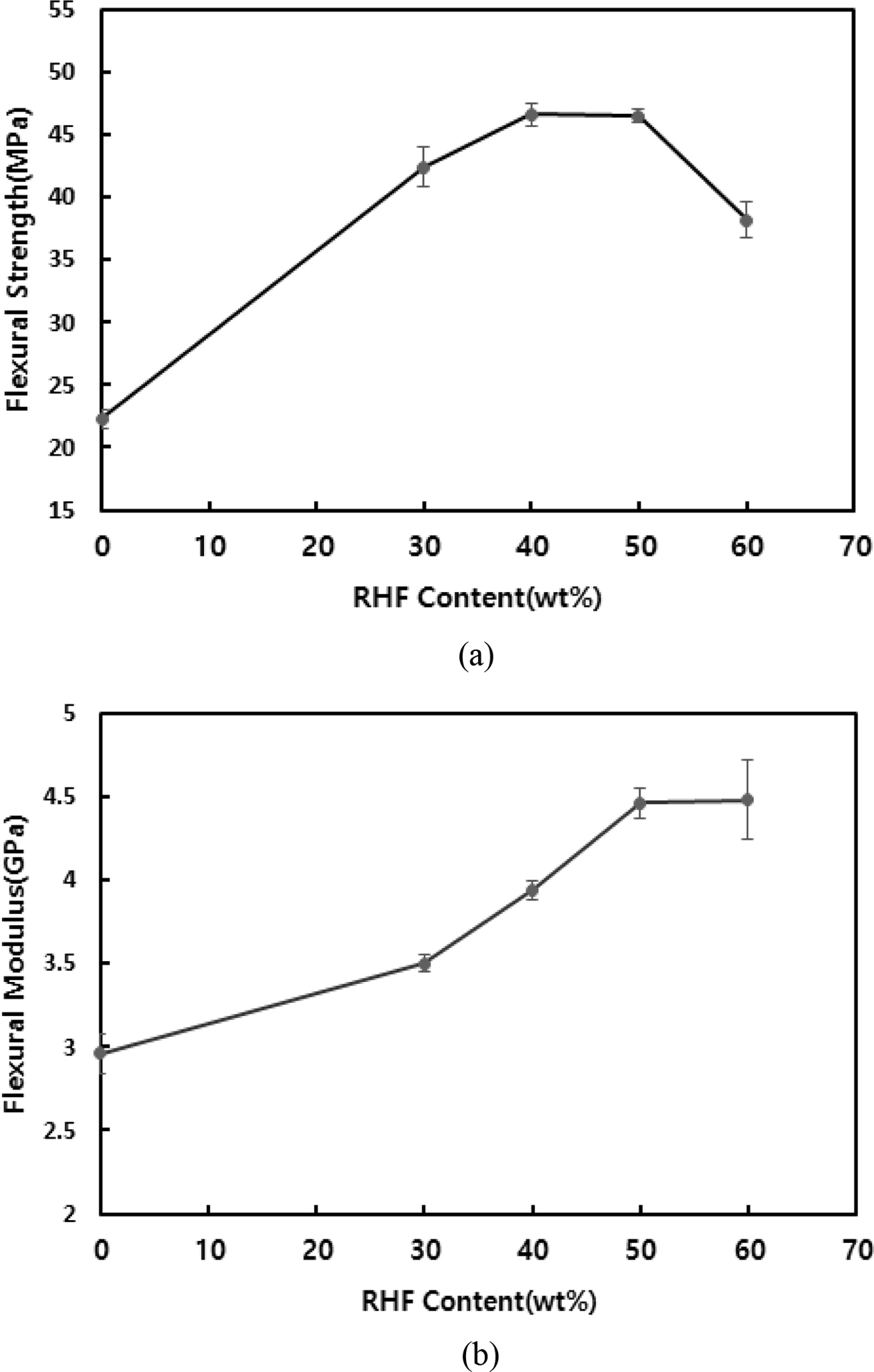 (a) Flexural strength; (b) flexural modulus of rice husk flour reinforced recycled polystyrene composites.