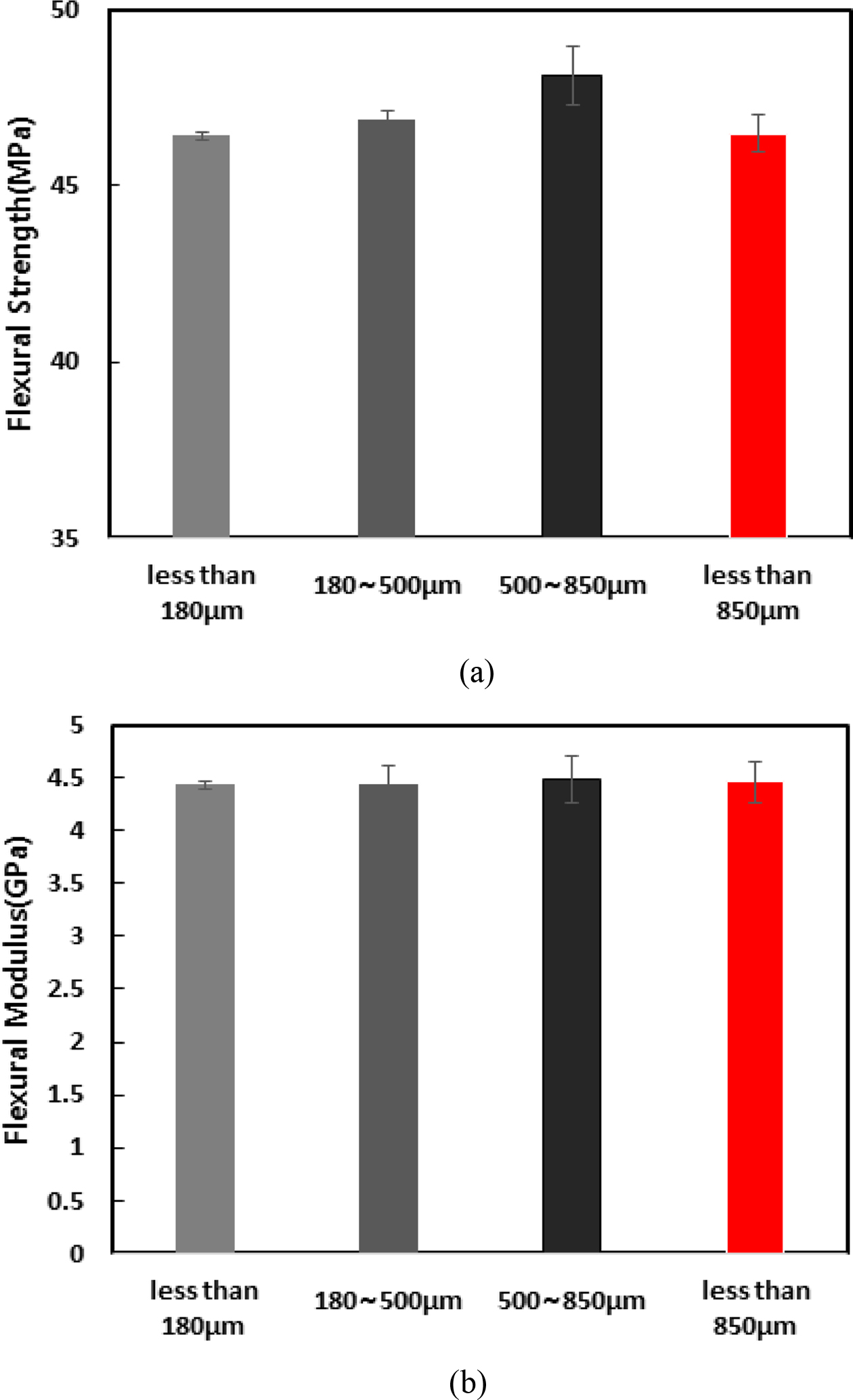 크기에 따른 물성변화를 살펴본 바 인장물성이 굴곡물성보다 크기 의존성이 크게 나타났지만 850 μm 이하인 왕겨분말을 사용해도 180 μm 이하의 왕겨분말을 사용한 것과 비교하여 큰 물성차이는 없었다.