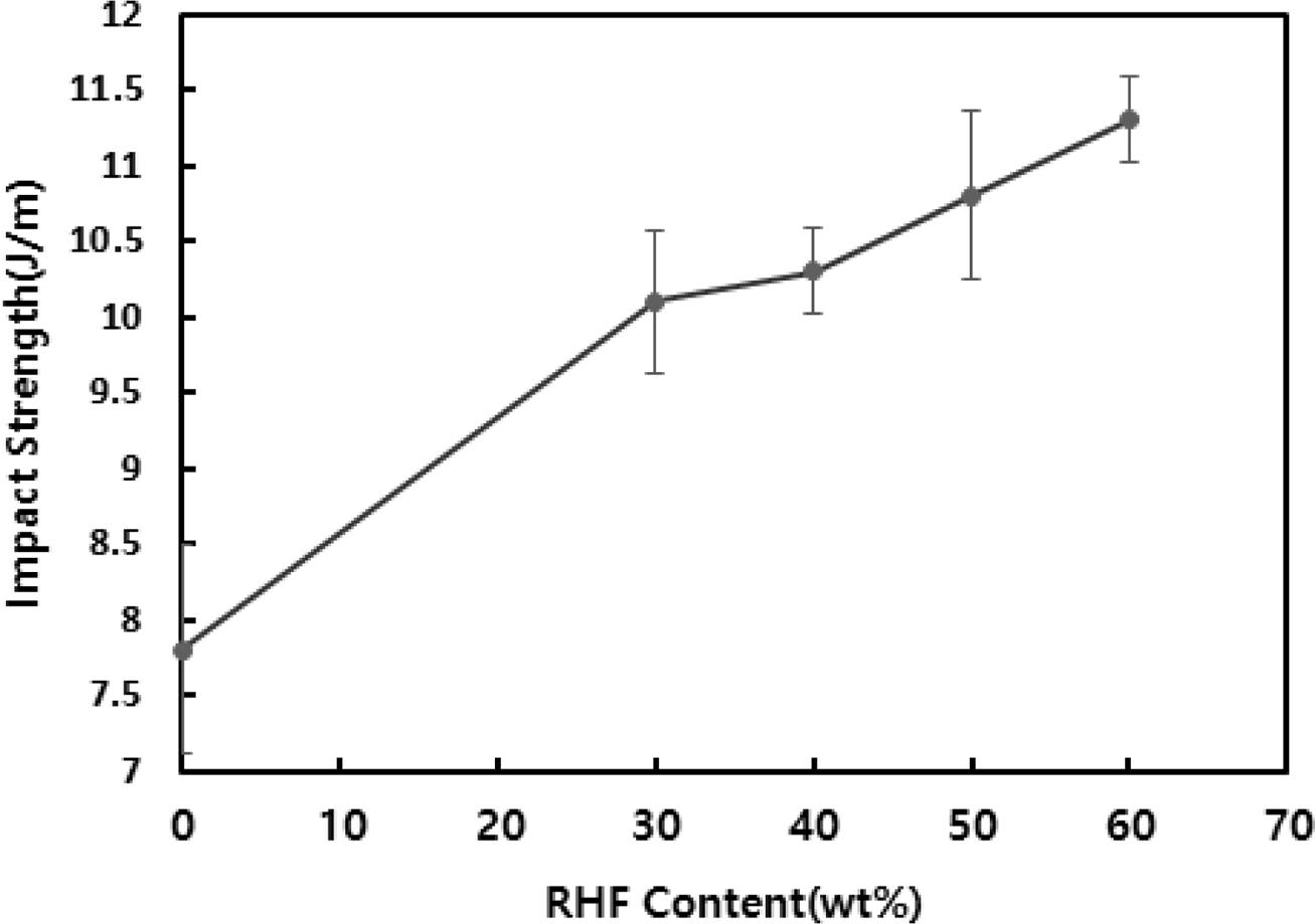 Notched Izod impact strength of rice husk flour reinforced recycled polystyrene.