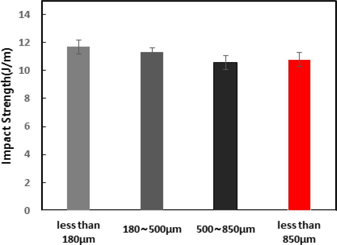 Notched Izod impact strength of rice husk flour reinforced recycled polystyrene composites with different size distributions of rice husk flour.
