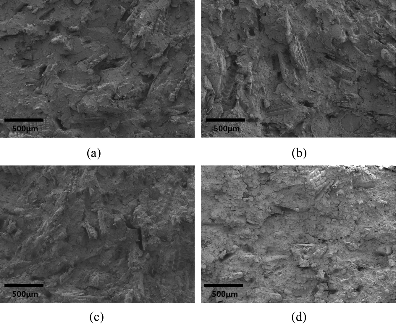 SEM images of rice husk flour reinforced recycled polystyrene composites: (a) rPS70(RHF 30 wt%); (b) rPS60(RHF 40 wt%); (c) rPS50(RHF 50 wt%); (d) rPS40(RHF 60 wt%).