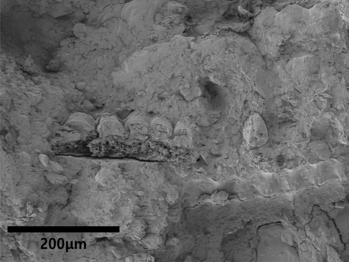 SEM image of torn rice husk flour at the cross section of rPS/RHF composite made by the flexural force.