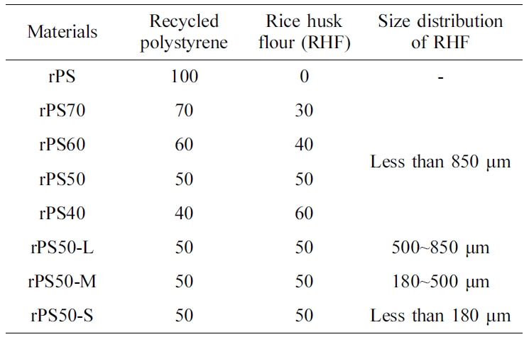 재료. 재활용 폴리스티렌(rPS) 분말은 가전 완충재 및 식품 포장용 등으로 사용된 것 중에서 비교적 깨끗한 폐스티로폼(waste styrofoam)을 골라 170 oC 오븐에서 약 3분간 열처리하여 부피를 1/10 이상 감축시킨 다음 분쇄기(한일전기, HMF-3260S)로 1분간 분쇄한 것을 그대로 사용하였다. 재활용 폴리스티렌 분말의 겉보기 밀도는 0.233 g/cm3으로 측정되었다. 왕겨분말은 나락 도정과정에서 발생한 왕겨로 ㈜삼정농산에서 100리터를 구입하여 분쇄기로 2분 간격으로 5회 총 10분간 분쇄한 다음 850 μm(20 mesh) 표준체(청계씨브(주))를 통과한 것(겉보기 밀도는 0.461 g/cm3)을 함량에 따른 물성 연구에 사용하였다. 또한 왕겨분말의 크기에 따른 물성 차이를 연구하기 위하여 850 μm(20 mesh), 500 μm(35 mesh) 및 180 μm(80 mesh) 표준체를 이용하여 180 μm 이하, 180~500 μm 및 500~850 μm 세 가지 시료를 준비하여 재활용 폴리스티렌 분말에 50 wt% 함량으로 혼련하였다. 왕겨분말들은 수분을 최대한 제거하기 위하여 100 oC 오븐에서 48시간 건조한 것을 비닐봉투에 담아 사용하였다.