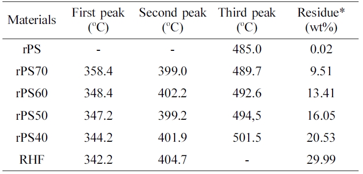복합재료의 열분해는 3단계로 일어났고 첫째 단계는 가장 낮은 342 oC 부근에서 헤미셀룰로오스와 셀룰로오스의 분해로 둘째 단계는 405 oC 이하에서 주로 리그닌의 분해에 의해 그리고 마지막 단계는 485 oC 이상에서 PS의 분해에 의한 것이었다. 왕겨분말의 존재로 복합재료의 내열성은 485 oC 이하에서는 나빠졌고 그 이상에서는 높아졌다. 왕겨분말의 실리카 함량이 높아 복합재료의 793 oC 잔류량이 왕겨분말 함량에 비례하여 증가하였다.