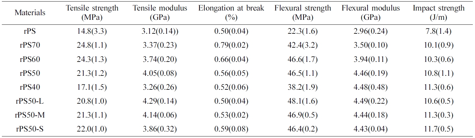 기계적 물성에서 인장강도와 신율은 왕겨분말 30 wt%(rPS70)에서 최대값을 보였고 인장탄성률은 50 wt%(rPS50)에서 최대값을 보였다. 굴곡강도는 왕겨분말 40 wt%(rPS60) 및 50 wt%(rPS50)에서 최대값을 보였고 굴곡탄성률은 60 wt% (rPS40)까지 계속 증가하였다. 충격강도는 60 wt%까지 거의 선형으로 증가하였다. 왕겨분말 60 wt%의 물성이 예상보다 나쁜 이유는 점도가 급증하여 마찰열 발생으로 열산화에 의한 열화 때문으로 생각된다. 복합재료의 밀도도 왕겨분말 함량이 증가할수록 선형에 가깝게 증가하였다. 왕겨분말 강화 재활용 폴리스티렌 복합재료는 강한 상호작용의 존재로 상용화제 또는 커플링제의 첨가나 왕겨분말의 표면처리 없이도 우수한 기계적 물성을 보였다.