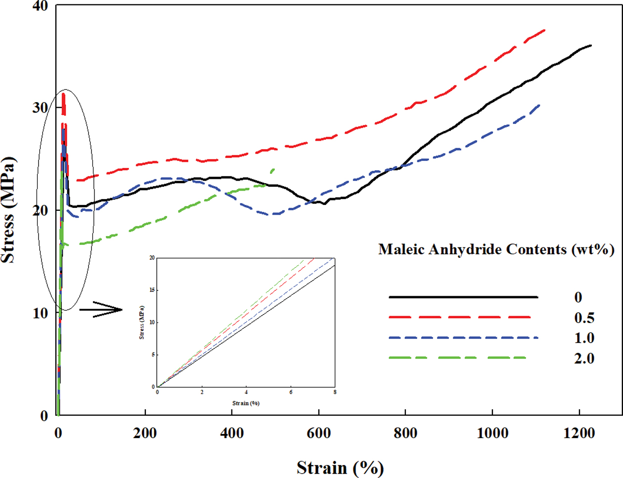 Stress-strain curves of polypropylene film with PP-g-MA.