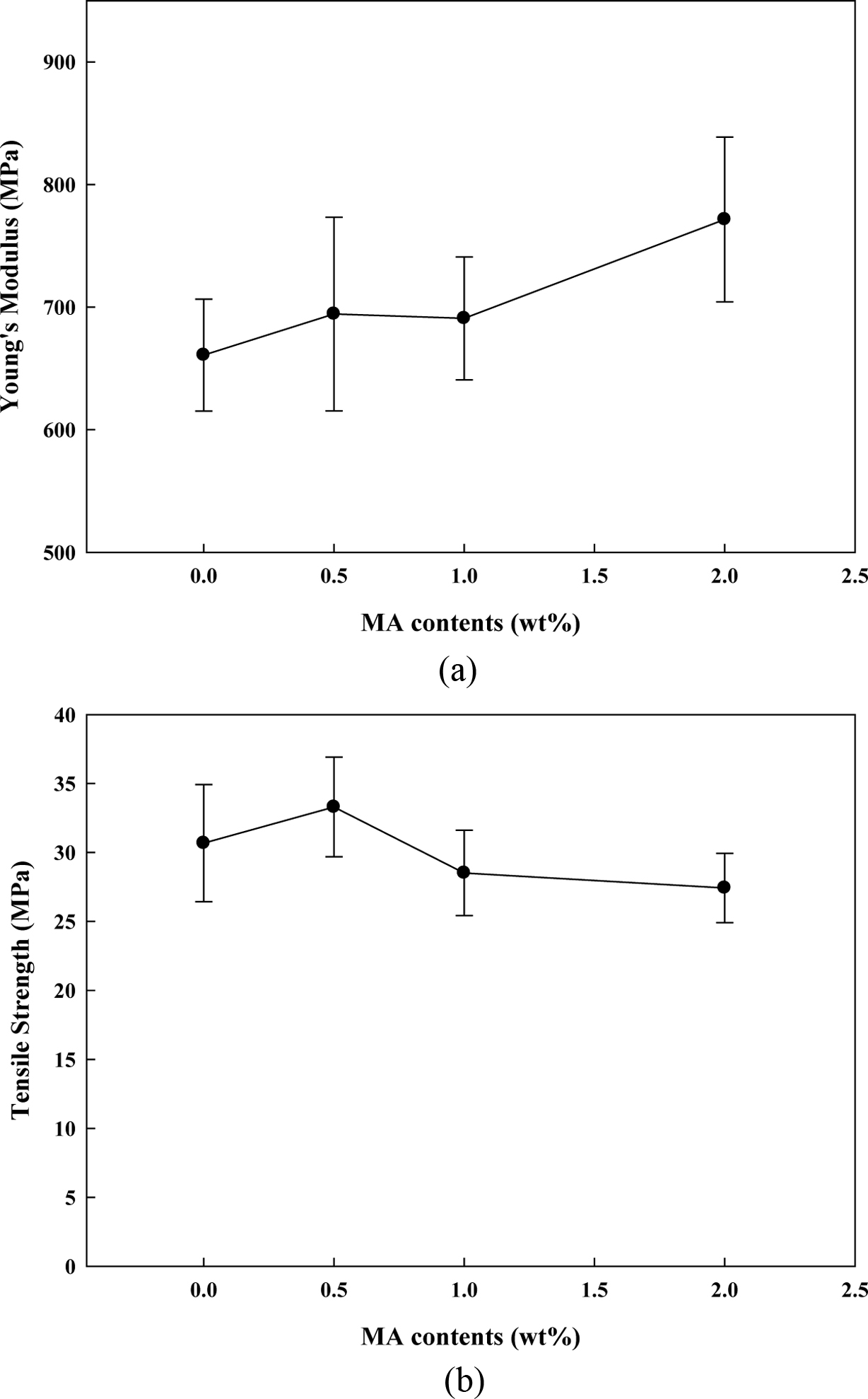 Mechanical properties of polypropylene film with PP-g-MA: (a) Young’s modulus; (b) tensile strength.