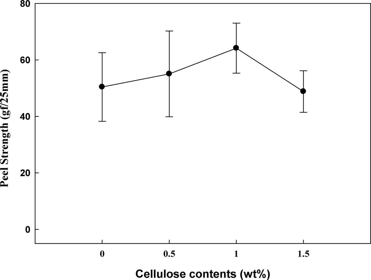 Figure 4에 나노 셀룰로오스를 1.0 wt%의 무수산기가 함유된 PP로 제조된 PP 필름과 N6 필름 접합 시 셀룰로오스 첨가 함량이 PP/N6 접합 필름 접착력에 미치는 영향을 나타내었다. 그림에서 보는 바와 같이 셀룰로오스 함량 1.0 wt% 까지 접착력이 30% 이상 증가함을 알 수 있다. 이러한 접착력의 증가는 PP가 가지고 있는 무수산기와 나노 셀룰로오스 섬유 표면의 하이드록실기의 결합에 따른 결과이다. Figure 5에 PP 필름, 무수산 함유 PP 필름(1.0 wt%) 그리고 나노 셀룰로오스 섬유가 0.5 wt% 첨가된 무수산 함유 PP 필름의 FTIR 결과를 나타내었다. 그림에서 보는 바와 같이 무수산 변성 PP 필름은 일반 PP 필름에서 보이지 않은 무수산기에 기인된 C=O에 따른 흡수 피크가 1750-1800 cm-1에서 발현됨을 보이며 나노 셀룰로오스 섬유가 첨가된 무수산 함유 PP 필름에서도 같은 피크를 확인할 수 있다. 특이한 사항은 나노 셀룰로오스 섬유가 첨가되면 피크의 크기가 증가되는 것으로 보아 셀룰로오스 섬유 표면의 하이드록실기와 무수산 간의 화학적 결합이 발현됨을 알 수 있다. 셀룰로오스 섬유와 무수산기의 결합에 따른 C=O 피크의 변화는 Nenkoba 등에서도20 언급된 바 있다. 이러한 결과로부터 N6와의 접착력에 영향을 주는 무수산기가 나노 셀룰로오스 섬유와 결합하여 PP 필름에 분산됨에 따라 PP 수지에 존재하는 무수산기와 함께 N6의 접착력에 영향을 주어 Figure 4와 같은 접착력 증가로 나타남을 알 수 있다. 하지만, 지나친 셀룰로오스의 함량 증가는 셀룰로오스가 PP 표면에 존재할 가능성을 높이며 이들의 나일론과의 계면을 형성하여 접착력 감소 요인으로 작용할 수 있다.