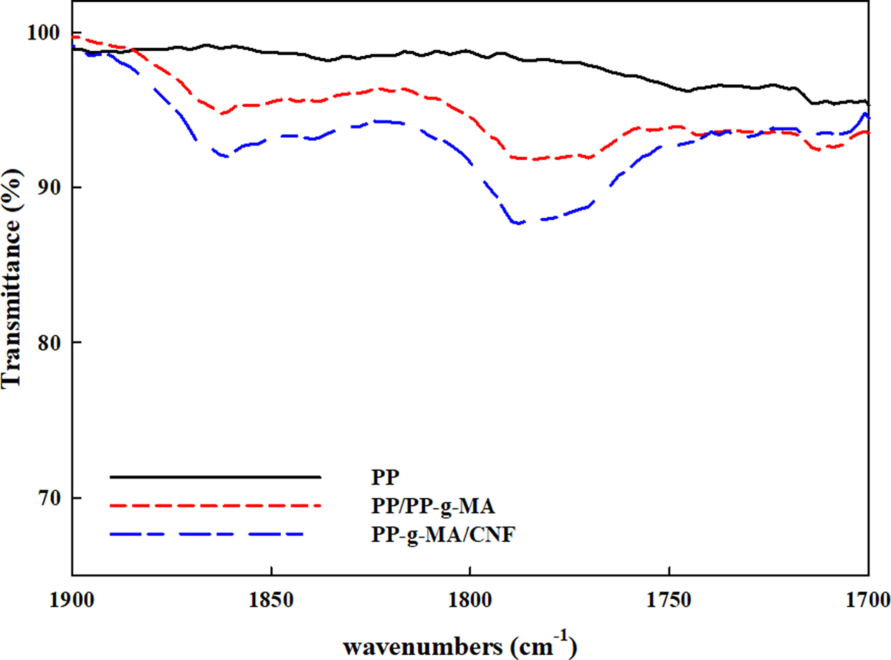 FTIR spectra of PP films with PP-g-MA and nano cellulose fibers.