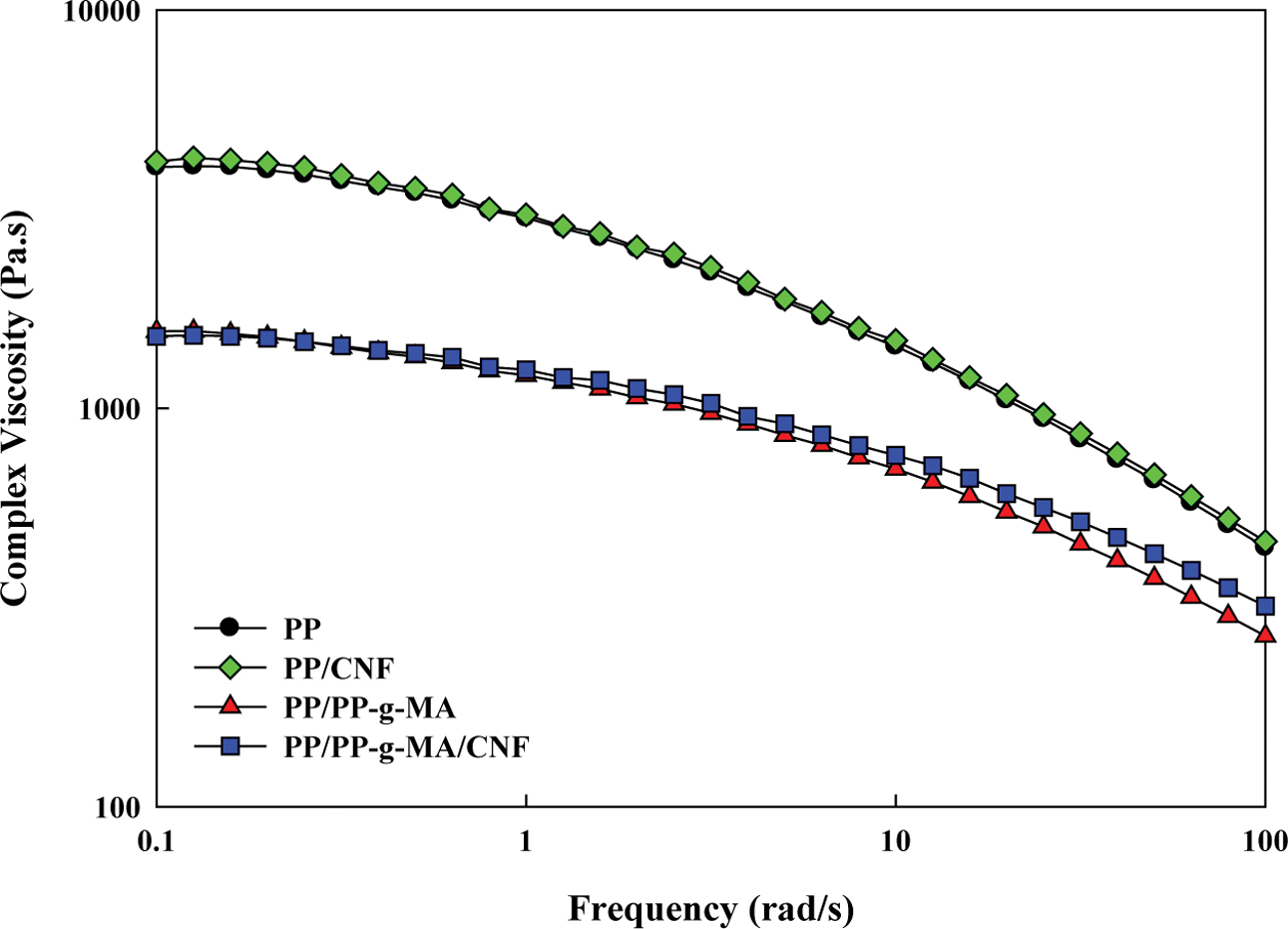 Rheological properties of PP, PP/CNF, PP/PP-g-MA (1.0 wt%) and PP/PP-g-MA with nano cellulose fibers (0.5 wt %) at 180 oC.