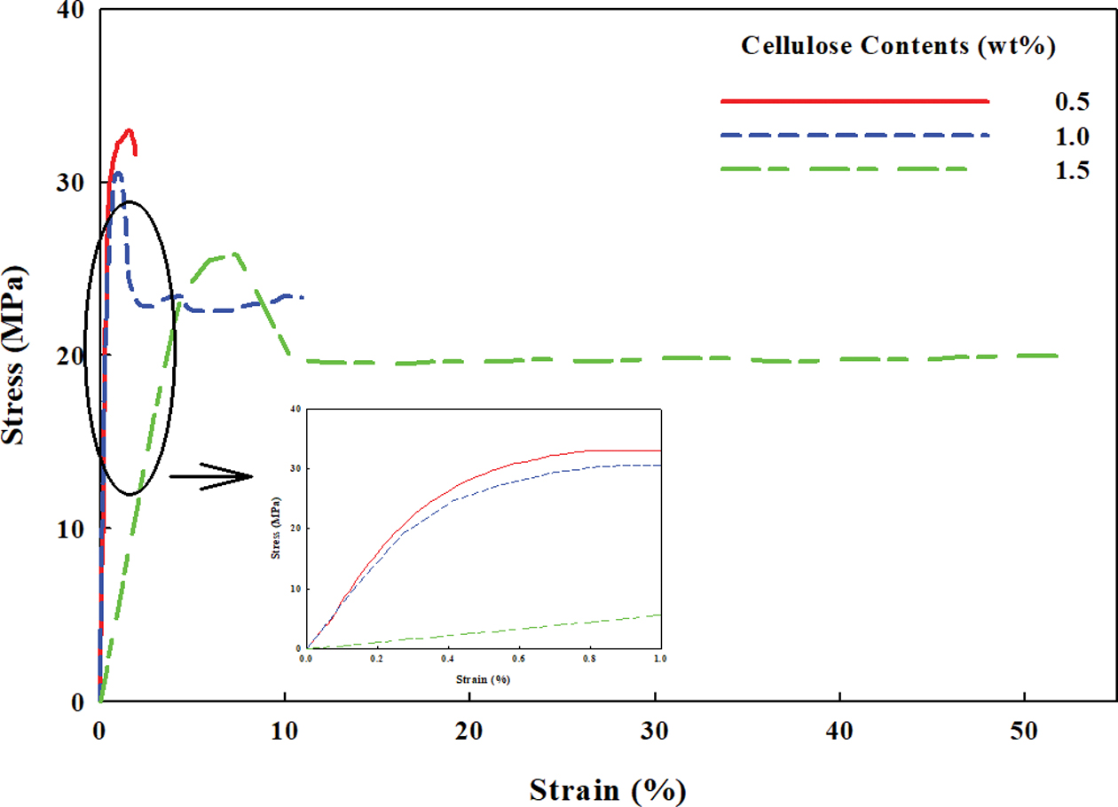본 연구에서 사용한 폴리프로필렌(PP)은 롯데케미칼 호모 폴리프로필렌(FC150B)을 사용하였다. 나노 셀룰로오스(CNF)가 함유된 PP 마스터 수지를 제조하기 위하여 무림제지로부터 공급받은 직경이 100 nm 이하인 나노 셀룰로오스 섬유를 롯데케미칼의 무수산 함량이 5%인 무수산 변성 PP-g-MA(PH-200)에 Hakke internal mixer를 이용하여 180 oC에서 혼합하여 제조하였다. PP 수지와 제조된 마스터 칩은 180 oC에서 Hakke internal mixer로 다시 혼합하여 제조하였으며 이때 무수산 함량이 0-2.0 wt% 그리고 나노 셀룰로오스의 함량이 0-1.5 wt%가 되도록 용융 혼합하였다. 얻어진 시료는 180 oC에서 큐머시스사 압축성형기를 이용하여 100×100 mm 크기에 두께가 100 μm인 필름으로 제조한 후, 크기가 5×35 mm의 인장 시험 시편을 제조 후 10 mm/min의 속도로 인장 시험을 진행하였다.