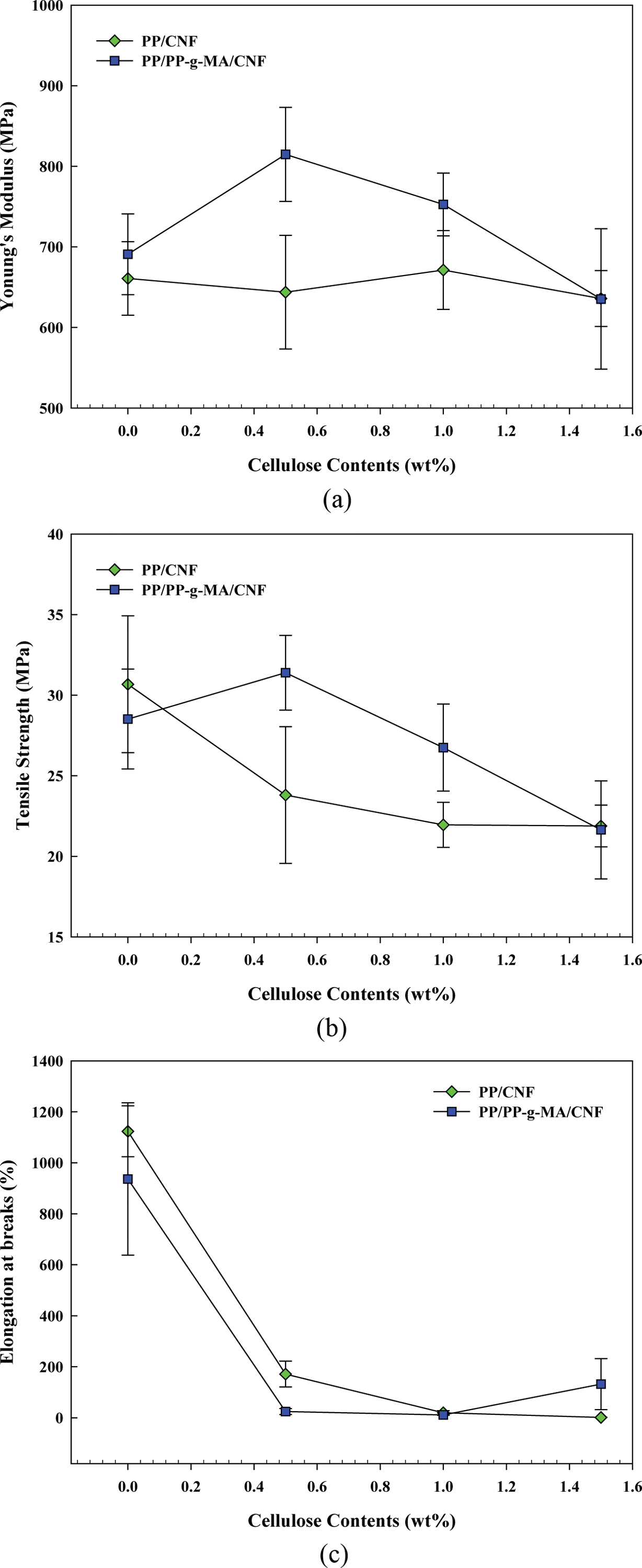 Mechanical properties of PP films with nano cellulose fibers: (a) Young’s modulus; (b) tensile strength; (c) elongation at breaks.