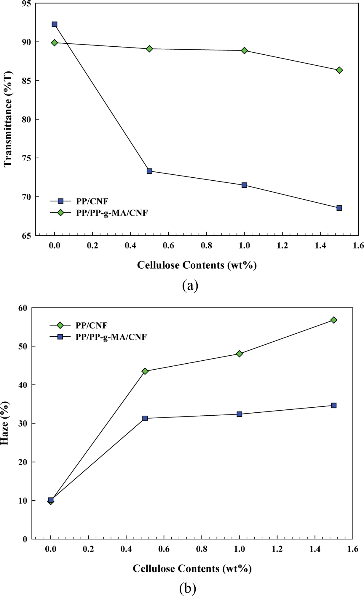 Optical properties of polypropylene films with nano cellulose fibers: (a) transmittance; (b) haze.