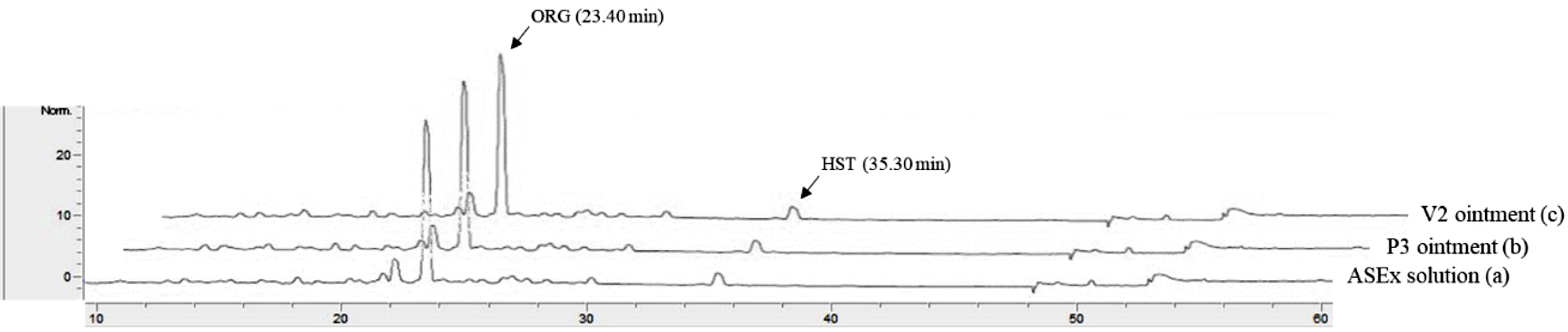 Figure 2 Typical HPLC chromatograms of ASEx in a stock solution (a); P3 ointment (b); V2 ointment (c). |