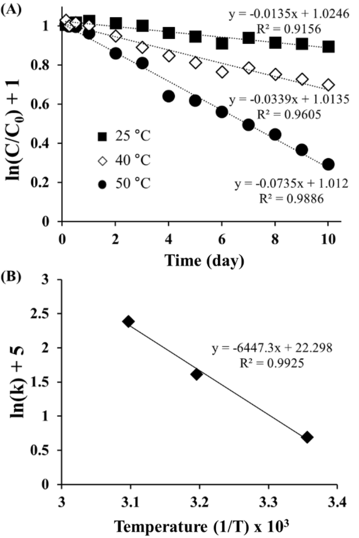 Figure 3 inetic a nalyses of ORG d eg radation: (A) F irst-order plots of remaining ORG in ASEx solution at different temperatures; (B) Arrhenius plot of the degradation rate constant versus the reciprocal absolute temperature. |