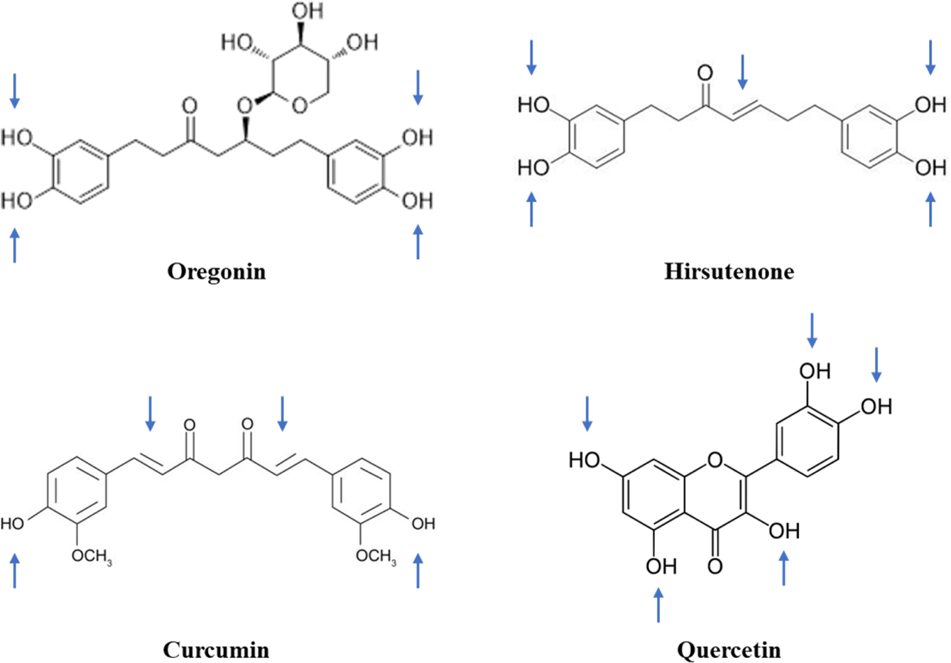 Figure 4 Comparison of the structural similarity of polyphenolic compounds. Blue-colored arrows indicate the possible points of degradation in the molecules. |