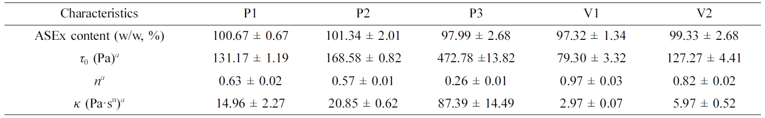 aCalculated by the Hershel–Bulkley equation: t0, yield stress; n, flow behavior index; κ, consistency index. Data are presented as the mean ± SD (n=3).ASEx, Alnus sibirica extract. |