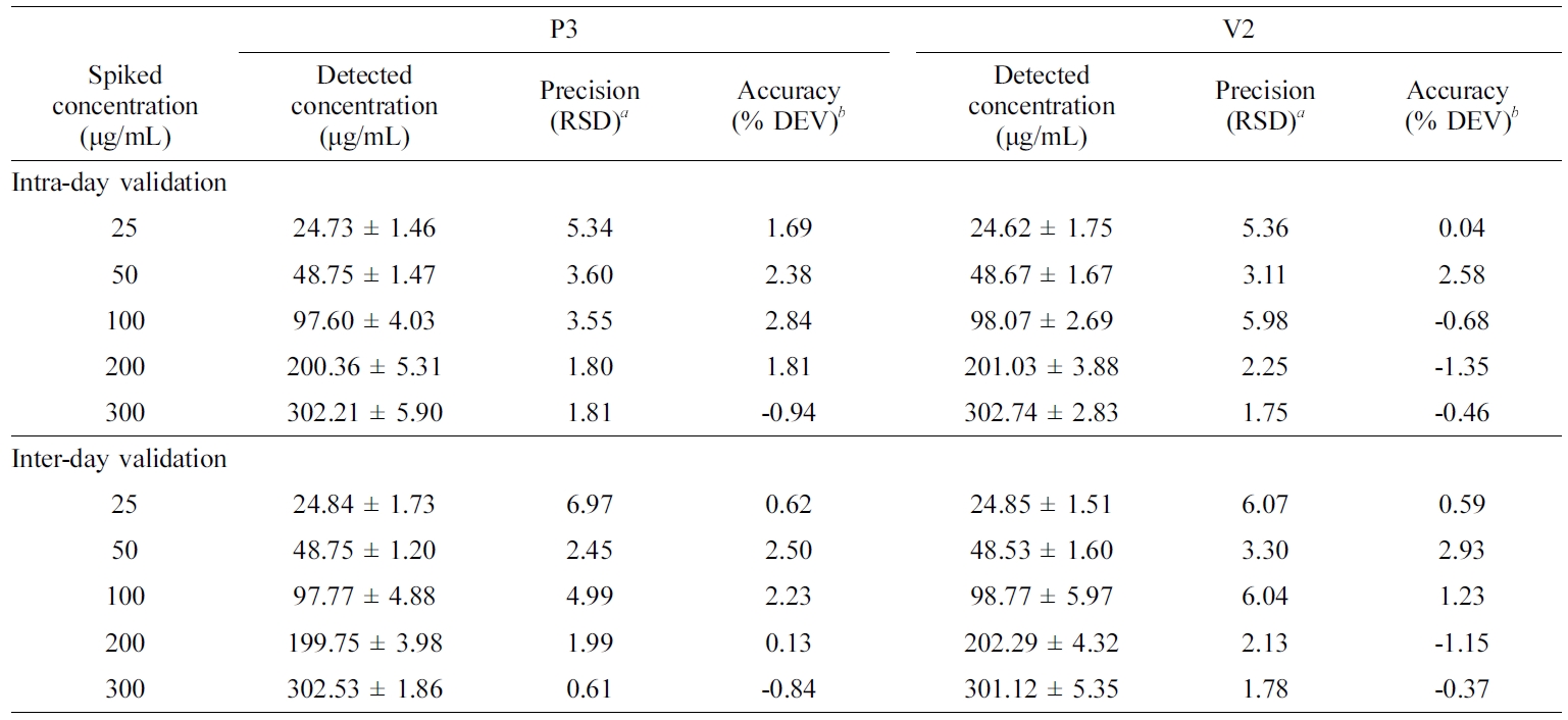 aCalculated by SD×100/mean. bCalculated by (spiked concentration – measured concentration)×100/spiked concentration. Data are presented as the mean ± SD (n=3). RSD, Relative standard deviation; % DEV, percentage deviation. |